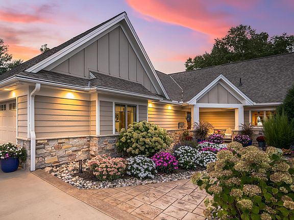 This stunning three-bedroom, three-bathroom home on German Lake is a rare retreat, set on 5.4 acres with 135 feet of private sandy shoreline. Thoughtfully designed, it offers an open-concept layout that captures breathtaking lake views and sunsets. Exquisite custom woodwork, Andersen windows, built-in speakers, and motorized shades create effortless comfort throughout. The living room impresses with a 15-foot vaulted ceiling, floor-to-ceiling windows, rustic white oak flooring, and a stone-surround gas fireplace, seamlessly flowing to the dining area and patio for effortless indoor-outdoor entertaining.