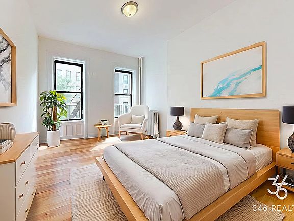 Both bedrooms are generously sized, comfortably fitting queen beds with additional space for furniture, and they each offer stunning park views and excellent natural light. The flexible layout allows for a third bedroom setup without compromising the flow or feel of the apartment. A long entryway is perfect for art, bookshelves, or a custom workspace, while polished hardwood floors and high ceilings add to the apartment's spacious, airy vibe.