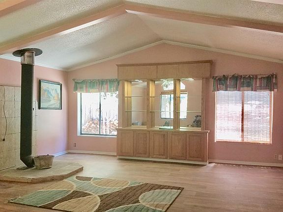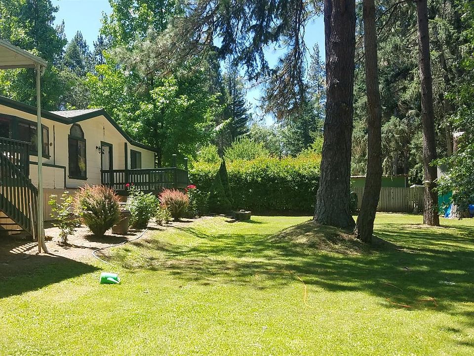 Want tranquility? No traffic noise? Over half an acre? How about an open floor plan with pitched ceilings and a place for a wood stove to stay warm on those cold winter nights! This spacious manufactured home separates the master bedroom on one end from the other bedrooms on the opposite end. Open kitchen with breakfast bar and an island for gas cooking. Use the small deck for entertaining or ground floor outdoor BBQ area. Even has a two-story doll house that is currently used for equipment storage. Lawn is sprinkler-irrigated using GPID water rights ($230/year). Take a look and bring your offer!
