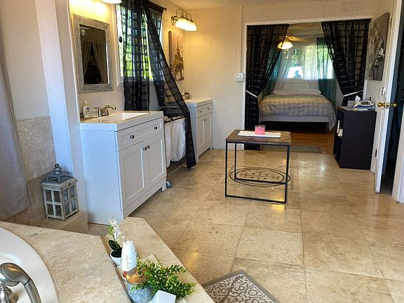 Beautiful ocean and city views of Bayfront and Hilo, this furnished home is conveniently located just above Hilo town close to Mohouli Park. E Komo mai, the home welcomes you with a quaint tiled foyer with knotted pine walls surrounding the entrance. The open living room is well lighted with large windows and fully furnished with large sectional, coffee table, butcher block dining table, and wine refrigerator. The kitchen features knotty pine ceiling, butcher block back counters, tiled back wall, large front laminate counter with knotty pine lower half and bar stools. The large master bath has a jacuzzi tub, walk in shower, and his and her vanity and cabinets. The front of the home features a large deck for outdoor entertaining and ocean viewing and a two car carport. The lot is well landscaped and fully fenced. The home is being sold “As-Is”. Photos were taken before tenant occupied property (refrigerator was replaced just before tenant occupied).