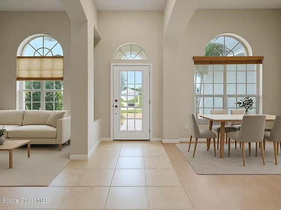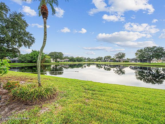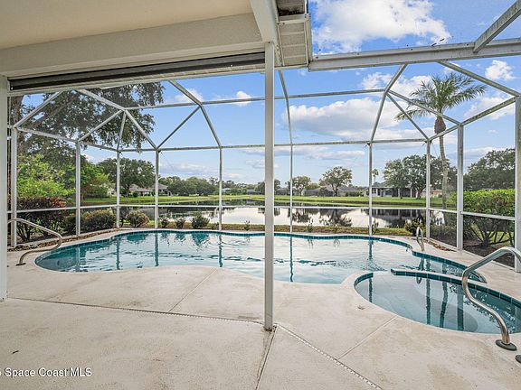 Experience panoramic WATER VIEWS in the highly sought-after Vizcaya Estates! Come see this 4-bedroom, 2-bath home with a 2-car garage and a NEW ROOF 2024. Freshly painted interior and exterior. Light and bright floor plan with soaring ceilings in the main living areas. NEW AC 2025. Tile and laminate flooring throughout—NO CARPET! The spacious kitchen offers plenty of cabinet space and opens to the breakfast nook and family room. The primary suite features a walk-in closet, handicap-accessible tub, separate walk-in shower, and dual-sink vanity. Guest bedrooms provide generous space for family or visitors, while the second bathroom includes a tub/shower combo and a convenient pool door. The backyard is an entertainer's paradise, boasting a screened-in pool and a large covered area—perfect for relaxation and fun! Conveniently located within walking distance to Suntree Elementary, golf, shopping, and major roadways. Just minutes from Patrick Space Force Base and the BEACH! Call today!
