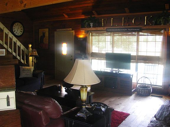 Open kitchen. Great room has natural cedar walls,tongue and groove vaulted ceilings and opens up to 2nd story loft. Master suite in loft with full bath and sitting room. Detached 2+ car garage and work area. Apartment overhead with bath and kitchenette project started.. Nice barn with 4 stalls, elec/water. Pond is stocked with Bream, catfish, and Bass.