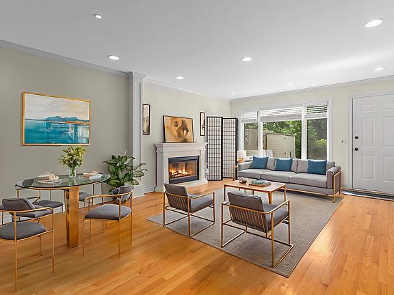 Elegant master suitePrivate patioGleaming hardwood floorsClean all-white kitchenBreakfast barSecond-floor laundryDouble-sink vanity