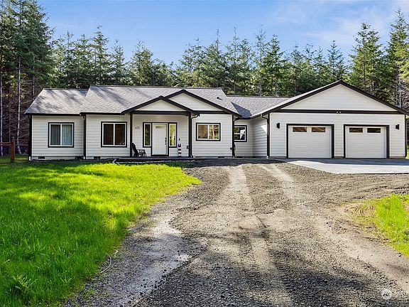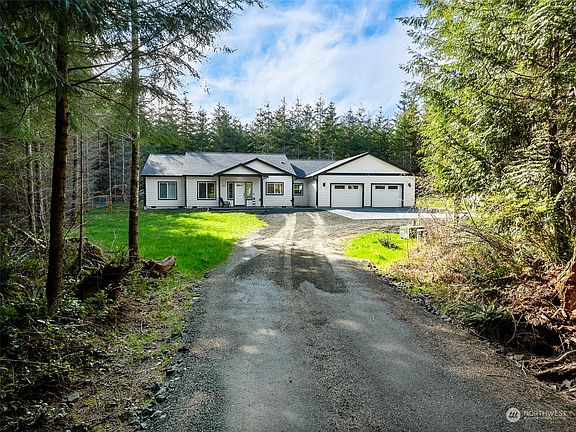 Make this beautiful home yours today! Sitting on a serene 3.22 forested acres in Shelton, this stunning rambler was built in 2023 & offers 4 bed, 2.5 bath 2,641 sf, an open & split bed floorplan with 9-ft ceilings, expansive bedrooms, a light-filled great room with a linear propane fireplace flanked by custom built-ins; large kitchen with custom cabinetry, high-end quartz counters, huge island, and butler pantry with its own sink & refrigerator. The expansive primary suite offers a sitting area, 5pc ensuite bath & walk-in closet. Plus, you'll love the large utility room, oversized 720 SF, 2-car garage, RV parking with hook-ups, heat pump, hardwire generator hookup, French drain & more. It has a secluded feel but is only mins from amenities.