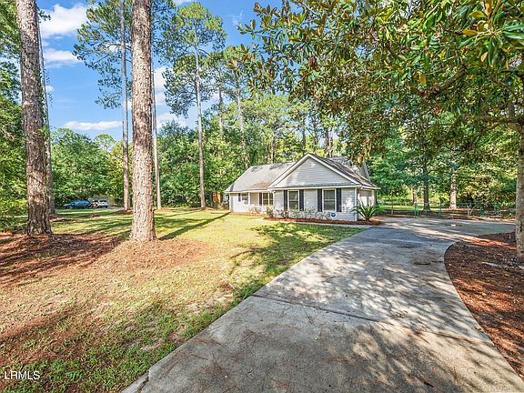 Tucked well back from the road and shaded by tall pines, this home offers a comfortable living area w/ vaulted ceiling, FP w/whitewashed tile surround, glass doors to spacious screened porch and adjacent large concrete pad. A sunny DA featuring double windows and built in bench cabinet opens to the KIT wSS refrig,dw, double sink, Pantry. Guest 2 BR wing w/renovated tiled BTH can be separate living quarters. One BR features a Murphy Bed, the other has own heating/cooling system and access to porch and backyard. The Owners Suite is ADA compliant w/wide doorways, roll in vanity and huge roll in shower w/bench, grab bars, 3 shower heads. Linen and hall closet, Laundry room w/door to 2 car garage complete the layout. Fenced backyard w/shed/ramp. Fire pit, too! Don't miss out on this home!