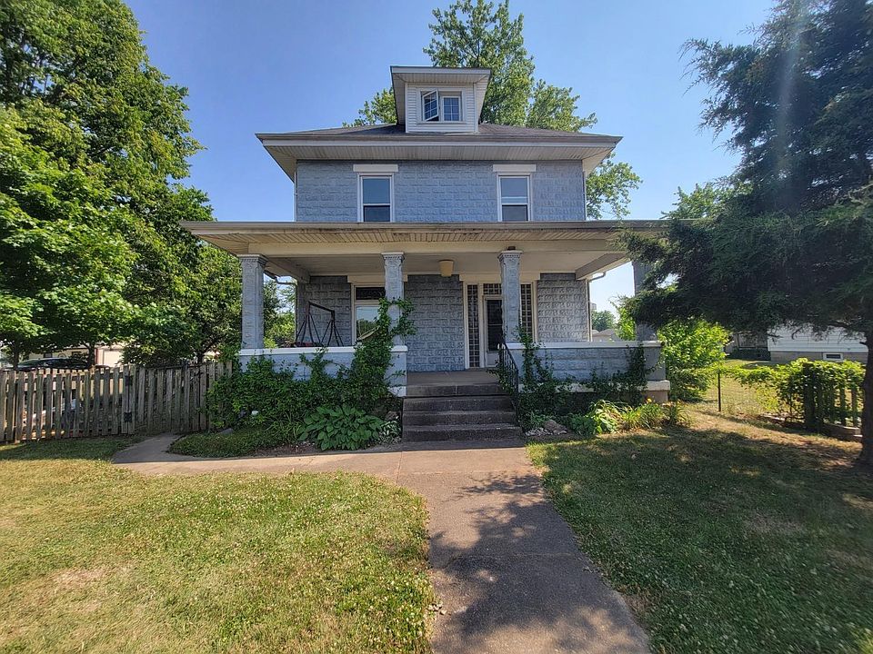 Spacious 3 Story with lots of character located close to Joyce Park. Large rooms with high ceilings & hardwood floors. Covered front and back porch. Fenced yard with shade trees & firepit. Primary suite has vaulted ceilings and walk-in closet. Vinyl replacement windows & lead glass windows. Newer HVAC. Oversized 1 car garage with workshop & loft.