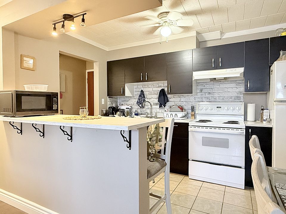 Welcome to this stunning, updated rental unit offering an open-concept layout with modern amenities. The kitchen boasts new cupboards with a stainless steel faucet and pull handles. New appliances (fridge and stove) are included. Enjoy preparing meals on beautiful Marble like countertops and white subway tiles, with an island that overlooks the living room.