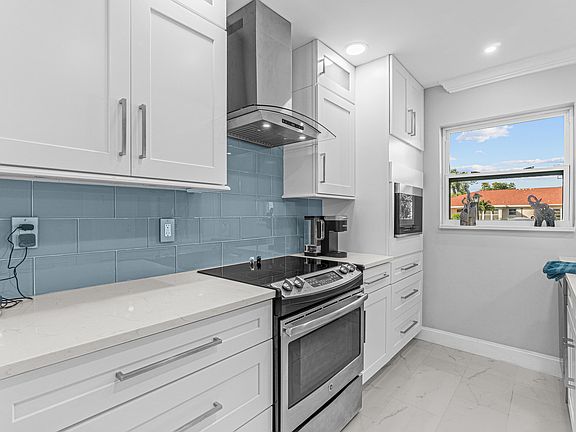 Welcome to High Point of Delray Section 7, a 55+ community located near famed Atlantic Avenue and downtown Delray Beach. This luxurious fully renovated condo offers a large open floor plan w/porcelain tile floors throughout, kitchen with trendy backsplash, stainless high end appliances, new wooden cabinets, waterfall edge quartz counter top, modern LED lighting. The one bedroom condo has two new beautiful bathrooms, take a hot bubble bath in the luxurious standing tub or a steamy shower in the en suite bathroom that features a large step in shower stall . The roomy one bedroom walk - in closet has newly installed built-in & linen cabinets . The home has hurricane impact windows ,screened in patio and outdoor terrace.