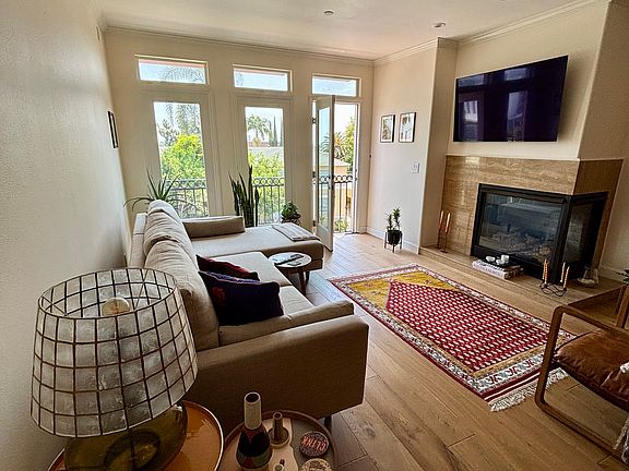 Open Living & Dining: Wide-plank wood floors, high ceilings, recessed lighting, and a cozy gas fireplace create a warm, inviting space. French doors open to a Juliet balcony with treetop views.