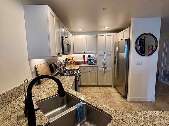 Chef's Kitchen: Granite counters, stainless steel appliances, ample cabinet storage, and breakfast bar seating perfect for everyday cooking and entertaining.