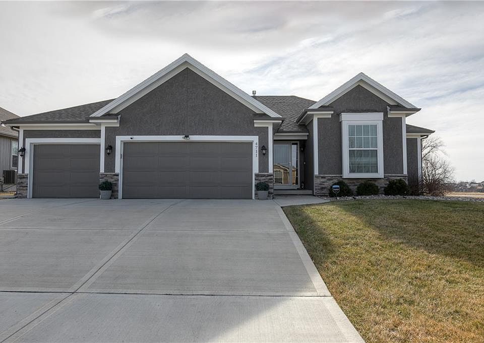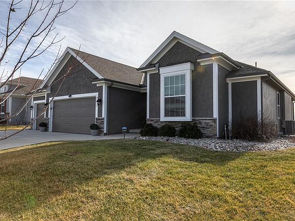 See this wonderful home in the sought after Falcon Lakes Villas!! You will love the large laundry/mudroom and open floor plan with THREE bedrooms on the main floor!! Wood flooring in entry, kitchen, dining and family room with tile in mudroom, laundry and bathrooms. Granite countertops, stainless appliances, kitchen island and walkin pantry as well as a gas fireplace in the family room, lots of windows for plenty of light and a covered patio! The lower level was finished in the last couple years with a very nice living area, large bedroom and a bathroom - stained concrete floor for easy maintenance! Falcon Lakes Villas are single family homes with all lawn maintenance and snow removal (over two inches) provided at a very reasonable cost ($1240 per year or $103 per month). It is a friendly neighborhood in a BEAUTIFUL golf course community. Just 10 minutes from the Legends shopping and entertainment district and 30 minutes to the airport, downtown or Lawrence! Acclaimed Basehor-Linwood schools.
