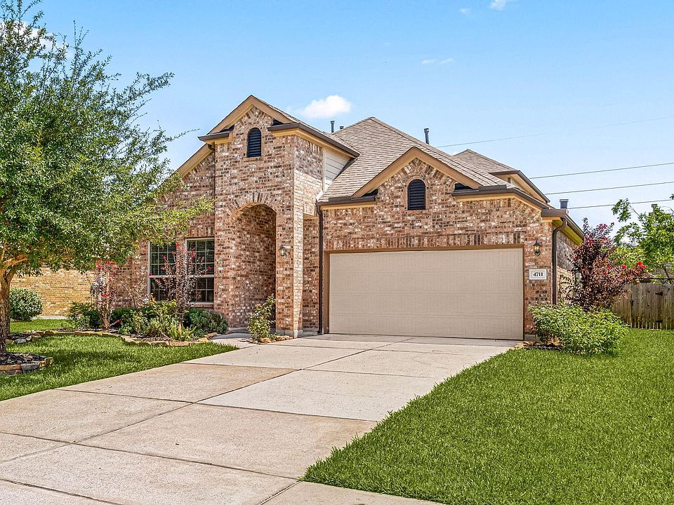 Welcome to this beautiful 4-bedroom, 3-bath Chesmar home with excellent curb appeal, featuring a classic brick exterior and a 2-car attached garage. All bedrooms are conveniently located on the main floor, including a spacious primary suite with ensuite bath, while an upstairs flex space offers endless possibilities, ideal as a game room, loft, or guest suite with a full bath. The inviting family room with fireplace flows seamlessly into the well-appointed kitchen, creating a perfect space for entertaining. Enjoy serene community living with two picturesque lakes, walking trails, and fountains just steps from your door. This home has never flooded and is move-in ready!