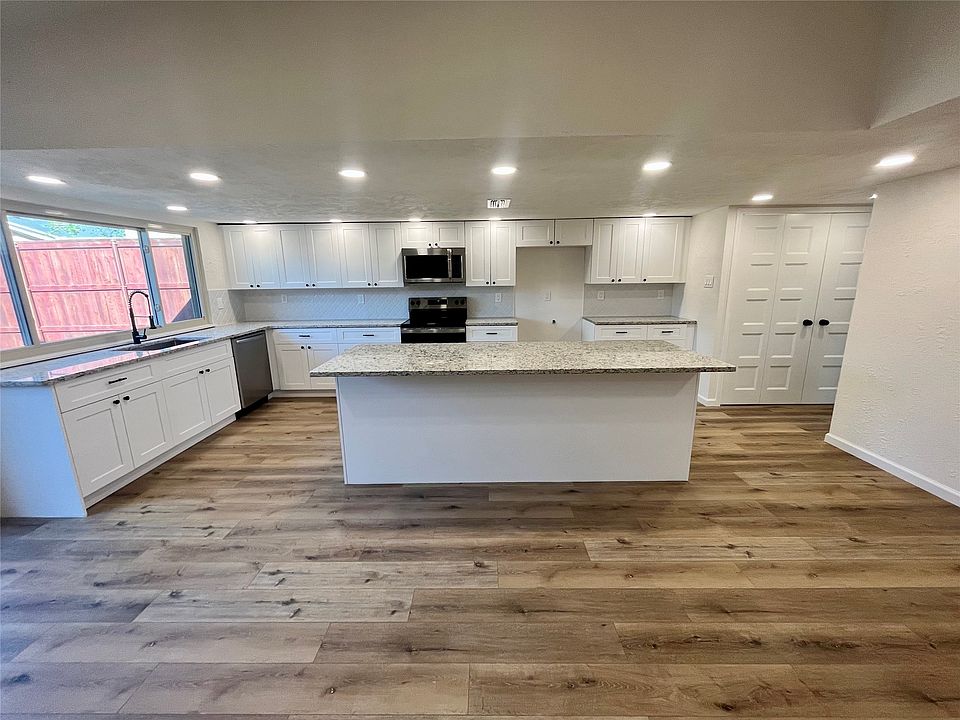 The fully renovated kitchen features white shaker cabinetry, granite countertops, stainless steel appliances, and an expansive center island with storage and seating — ideal for entertaining family and friends. A stylish barn-style pantry door adds a touch of farmhouse charm, while recessed lighting and a designer chandelier in the dining area complete the modern aesthetic.