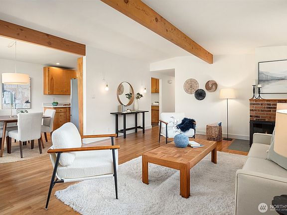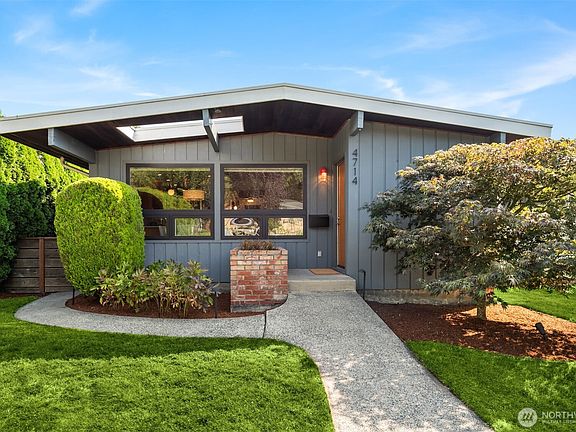 Mid-century rambler on a quiet street, tucked between the shops of Alaska Junction & the magic of Beach Drive. The smart floor plan offers 3 bedrooms and an open living/dining with a cozy gas fireplace. Vintage details remain—vaulted ceilings, large windows, original plywood cabinetry, brick fireplace surround, and a built-in planter. Full bath has been tastefully updated with penny tile, Kerf vanity, and Carrara marble. Don’t let the square footage fool you: an efficient layout, custom closets & clever storage maximize space. Recent updates include Andersen windows, furnace (2020) & water heater (2019). The kitchen features quartz counters, stainless appliances & gas cooking. West-facing windows fill the home with light. Pre-inspected.