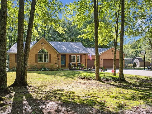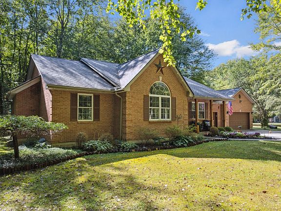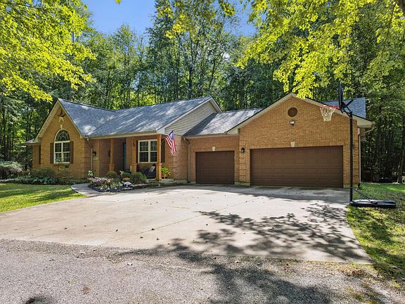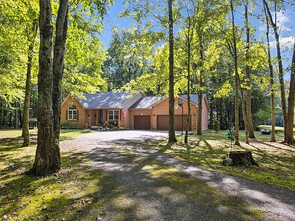Don't miss this beautifully updated brick ranch situated on 5 peaceful acres! Step inside from the welcoming covered front porch to find gorgeous hardwood floors thruout the entry, liv rm, din rm, kitchen & primary suite. The remodeled kitchen is a dream featuring rich wood cabinetry, granite countertops high end appl incl gas stove & direct access to a Champion-built 3-Season Room overlooking wooded privacy! 3 Bdrms, 2-1/2 Baths, 3-Car Garage. Living rm w/wbfp insert that heats the entire home offering both comfort and energy savings! The Primary suite w/cove ceiling & fully renovated ensuite bath! Finished LL Rec Room w/bar, game room & ready to finish plumbed 1/2 bath. Outdoor features include Composite Deck w/built in bench seating. Firepit area perfect for entertaining. 16x20 Barn w/loft & elec. and a 14x35 barn w/elec (both barns are ideal for storage, hobbies & more). Major updates incl HVAC '14, Roof '20, WH '21, Gilkey windows '16, Kitchen '17 , Primary bath '21, Hall bath '2