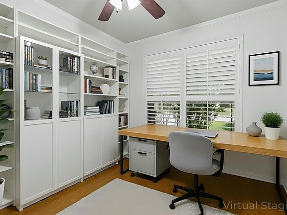 Welcome to the sought-after 55-plus Heritage Oaks community. This thoughtfully maintained single-story home with no stairs and fresh new paint offers a spacious 2 bedrooms, 2 baths, and a large office or 3rd bedroom. The roof is only six years old, providing valuable peace of mind and reducing future maintenance costs. Enjoy an inviting open floor plan designed for comfortable everyday living and easy entertaining. Tile flooring runs throughout the living room and kitchen with soft Roman shades, while warm wood floors enhance the primary bedroom, the formal dining area, and the dedicated office, creating a more refined feel. The kitchen features a large granite island that opens to the living room, along with abundant cabinetry, natural gas cooking, a stainless steel fridge that stays with the home, and generous prep space. A dedicated office or bonus room with French doors, plantation shutters, and custom built-ins provides a flexible workspace. The primary suite includes dual vanities, a soaking tub, and a separate shower. The guest bathroom features a therapeutic jetted tub with a built-in bench and handheld shower wand, designed to provide added comfort and support for seniors with easier entry and seated bathing. The enclosed patio or sunroom overlooks the tree-lined backyard with sprinkler systems and includes two cat doors that provide access to both the home and the backyard. There is a security system, a ring motion light, and a camera in the backyard for added peace of mind. Heritage Oaks offers an active lifestyle with several lush green walking trails, a community clubhouse, a ballroom with a full kitchen, a 24-hour fitness center, a library, a game room, billiards, darts, and a pond with a waterfall. Community activities include yoga, cooking classes, bingo, and happy hours to mingle with your neighbors and friends. Located approximately 10 minutes from the lake, Georgetown town square, and the historic Shell Ranch windmill.