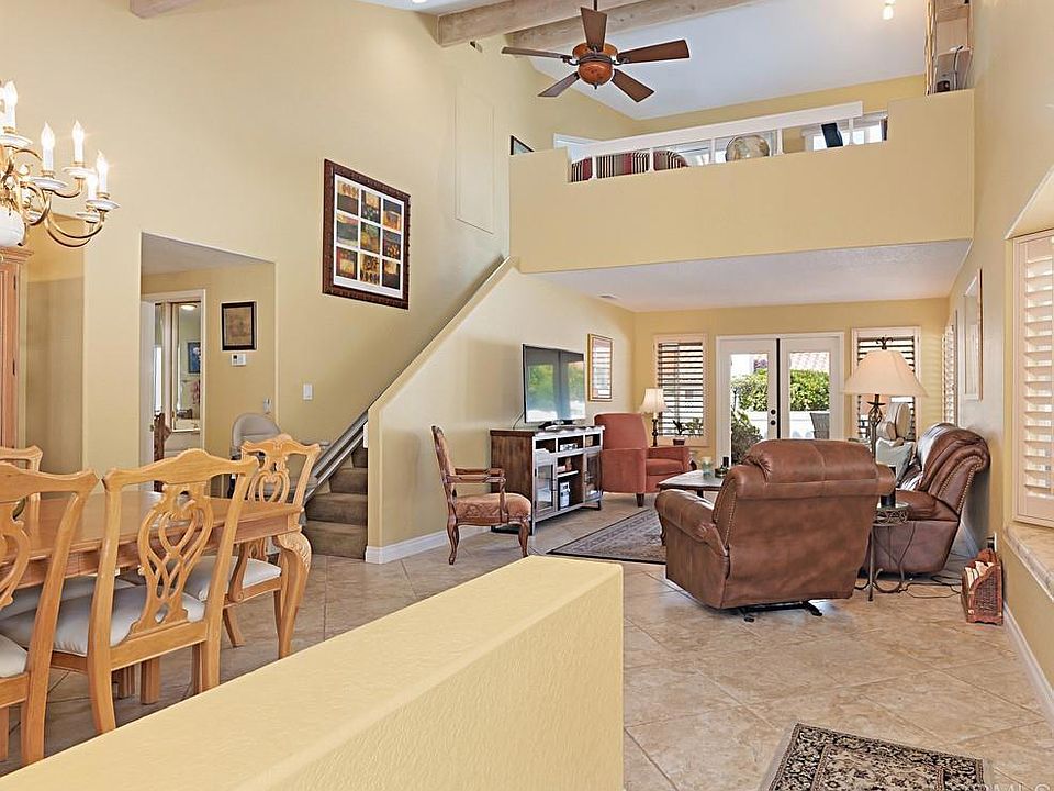 Back on market! Welcome to this charming 2-story home located approximately 2 blocks from the clubhouse within the beautiful, gated, 55+ community of Ocean Hills Country Club. Boasting a generous 1,899 square feet, this lovingly maintained residence offers flexible living space with dual primary suites, one on each level. As you enter the home, you'll appreciate the thoughtful layout and abundance of natural light that flows throughout. On the first floor you will find the well-appointed, eat-in kitchen featuring elegant granite counters, a coffered ceiling, and walk-in pantry, as well as a formal dining area, living room, a half bath and one of the primary suites. Upstairs you will find the second primary suite plus an inviting loft complete with custom cabinetry, desk, and wall shelving. This versatile space can be used as a home office, a cozy reading nook, or a hobby area. Outdoor living is a pleasure with multiple areas to choose from including spacious back and side patios as well as a balcony off of the loft featuring newer Trex decking. The low-maintenance yard includes an orange tree and automatic irrigation and is surrounded by vinyl fencing on all sides. The attached 2-car garage features a full size washer and dryer, whole-house water filtration system, and ample storage with cabinetry on both sides. As an added bonus, the exterior of the home was painted in Aug 2023 and the seller has completed all termite repairs and clearance has been received. Residents of this exceptional community have access to a wide array of amenities and activities, including an executive style 18-hole golf course, tennis, pickle ball, billiards, swimming pool, fitness facilities, dog park, over 53 social clubs, and more. This home is ready and waiting to welcome its new owners into a world of comfort and leisurely living!