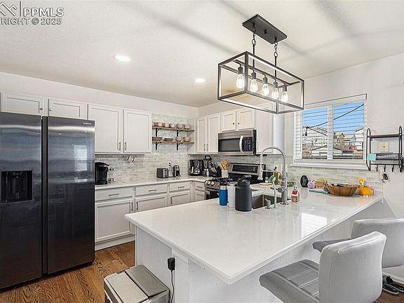Tucked away in a quiet cul-de-sac, this two-story home is filled with natural light and features a newly updated kitchen. The open-concept main level features hardwood floors and is filled with natural light from large windows. The kitchen stands out with updated white cabinets, quartz countertops, a gas stove, and modern appliances. A convenient half-bath and laundry area are also located on the main floor. Upstairs, the primary suite includes a walk-in closet and full private bath, along with three additional bedrooms and another full bathroom. The fully finished basement adds extra living space with a large family room and a private bedroom featuring its own walk-in closet and en-suite bath. Step out to a large, fully fenced backyard with direct walkout access from the dining area—ideal for playtime, backyard gatherings, or simply soaking in the fresh Colorado air. This home also features fully paid-off solar panels to help offset utility costs. Close to parks, schools, shopping, and both Peterson and Schriever AFB, this home offers a great mix of comfort and convenience.