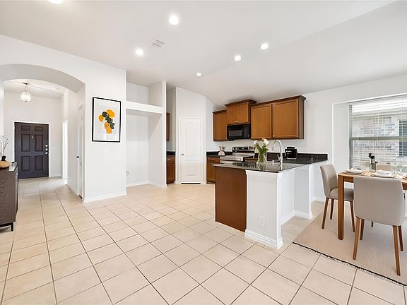 This home shines with curb appeal thanks to its manicured landscaping and welcoming front elevation. Step inside to find vaulted ceilings, arched doorways, and an open-concept layout enhanced by fresh paint and updated vinyl flooring. The kitchen offers abundant counter space, a breakfast bar, and direct connection to the oversized living room—perfect for gatherings. The private owner’s suite features a dual-sink quartz vanity, soaking tub, rainfall shower, and a generous walk-in closet. Guest bedrooms are tucked away, including one with built-ins, while the versatile 4th bedroom—with two closets—can double as a home office or flex space. Outdoors, enjoy a covered patio overlooking the lush yard and raised garden beds. Major updates include a recently installed lifetime architectural shingle roof with synthetic felt and impact resistance. Conveniently located near shopping, dining, Lake Worth, and in Eagle Mountain-Saginaw ISD—with no HOA!