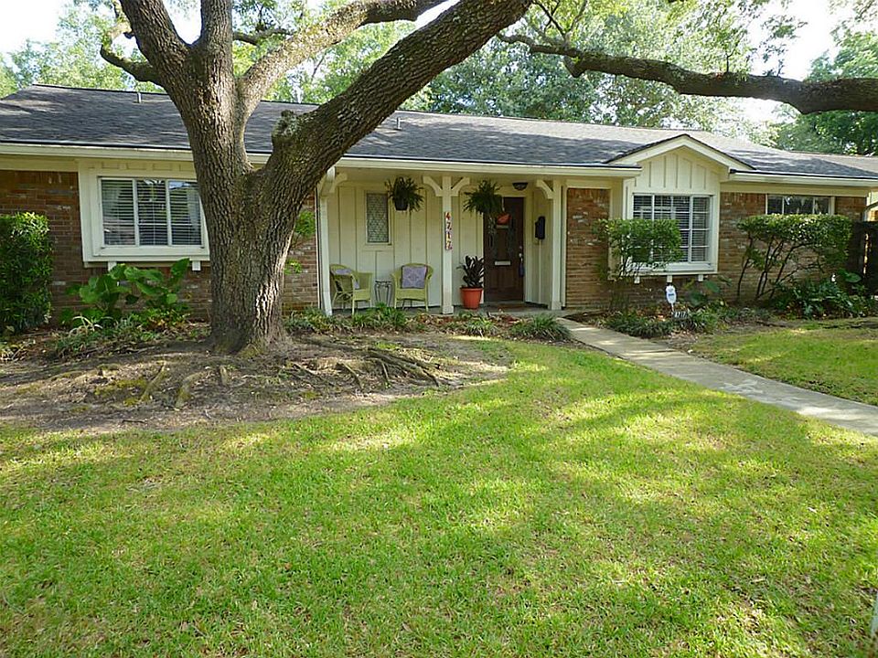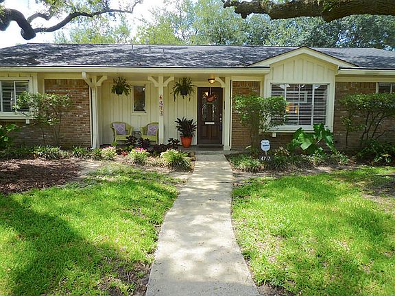 Never flooded! Spacious brick home. Majestic oak trees. Inviting beveled glass front door. Tiled entry hall. Crown molding. Graceful arches w/rounded sheetrock corners. Remodeled kitchen w/SS appliances, granite counters, travetine backsplash & recessed lights. Remodeled mstr bathrm w/huge shower. Dbl-paned glass door overlooking flagstone patio & large backyard. Indoor laundry. 4-Ton A/C-2015. Attic insulation. Underslab plumbing replaced 2013. Updated Electrical Service Panel. Walk-in closets!