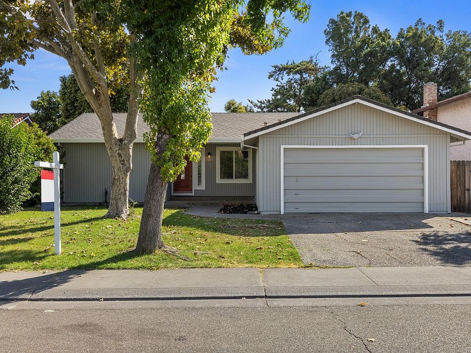 Step inside this beautifully refreshed home featuring a spacious open-concept living area with vaulted ceilings, modern recessed lighting, and a cozy fireplace. The updated flooring flows throughout, complementing the neutral paint tones. The kitchen offers ample storage and natural light, with easy access to the covered patio for indoor/outdoor living. Bedrooms are generously sized, and bathrooms have been tastefully upgraded with contemporary finishes. Outside, the backyard provides plenty of space for gardening, entertaining, or creating your own retreat. Complete with a two car garage, this home is move in ready and full of potential!