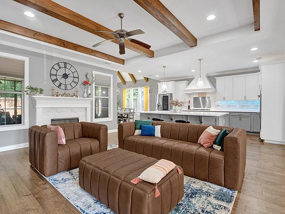 Welcome to this beautifully crafted Regency home, built in 2019 and nestled in a highly sought-after area with access to top-rated schools. Designed with elegance and functionality in mind, this open floor plan residence offers 5 spacious bedrooms and 4.5 luxurious baths, including two bedrooms conveniently located on the main floor. The heart of the home is a gourmet kitchen featuring gas cooking, premium appliances, abundant cabinetry, and a large island—perfect for everyday living and entertaining. Enjoy meals in the separate formal dining room or the inviting breakfast room. High ceilings and hardwood floors span the main level, enhancing the home’s expansive feel. Upstairs, Bedroom 3 boasts its own private en suite bath, ideal for guests or older children. All bedrooms are generously sized, offering plenty of space for relaxation and personalization. The covered back patio is perfect for year-round enjoyment, and a welcoming front courtyard that adds charm and curb appeal.