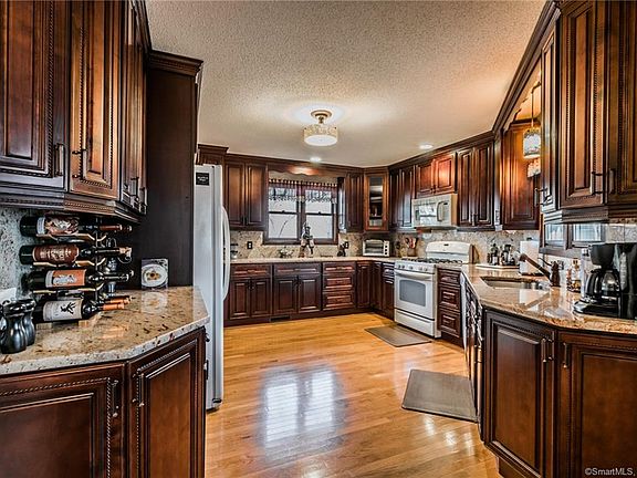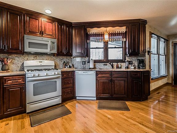 Elegant contemporary ranch with "L" shaped, open floor plan. NEW ROOF & NEW SEPTIC! 3 spacious bedrooms and 2 updated baths & kitchen make this home a dream! Beautifully situated on an almost acre lot, bordered with stone walls in the front. The rear yard is completely fenced, rear property line extends beyond the fence. Private partially covered deck with access to the master bedroom via french doors and additional door to the kitchen area. Many beautiful details in the upgrades of this home, truly move in ready. Cherry inlays in the oak hardwood floors, rope moldings on the cherry kitchen cabinets, modern tiled master shower, faux painting and contemporary lighting to name just a few. The open finished basement is a huge plus! Currently used as a game room, a great space for entertaining. The custom brick wall with built-ins is an eye catching feature and excellent use of space. Quiet neighborhood, and easy access to highways, minutes from Uconn. Definitely a must see!