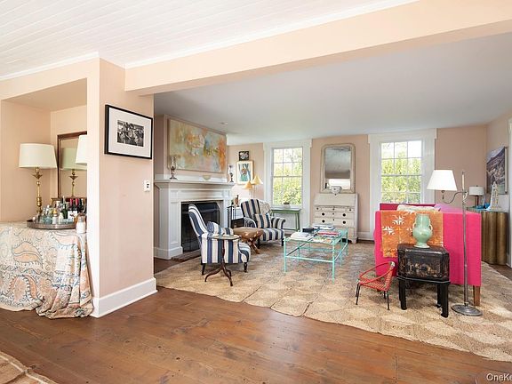 modern comforts. Situated on more than 31 acres of meadows and landscaped gardens, the property offers expansive views and a scenic pond. A garden entrance opens to a gracious Great Room where wide plank wood floors, built-in bookshelves, and a window seat create a warm, inviting atmosphere. A wood-burning fireplace with an antique mantel and brick hearth anchors the room, while the adjoining dining area, with entrance to the main floor bedroom, leads to the second floor via an elegant staircase. The nearby Media Room featuring the same rich flooring and built-ins, offers intimate spaces for reading or relaxation. The sunlit kitchen, with its desirable southwest exposure, combines traditional craftsmanship with contemporary style. Marble countertops, custom wood cabinetry are complemented by a high-end appliance, and a large walk-in pantry with terracotta tile. Adjacent to the kitchen, a mudroom provides access to both the front garden and side driveway, a stylish full bath completes the main level.