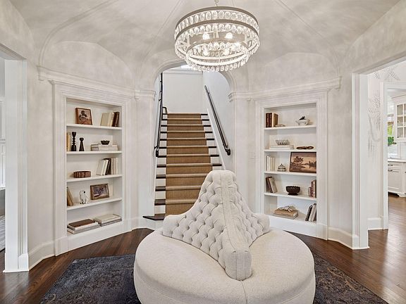 A gracious octagonal foyer welcomes you into a living room wrapped in windows and anchored by a wood-burning fireplace. A custom rotating bookcase conceals the television, a signature detail that underscores the level of intention found throughout the home. The dining room, fitted with a wall of built-ins, leads to a generous kitchen designed for serious cooking and easy gatherings. Wolf and Sub-Zero appliances, a steam oven, abundant storage, and a large island with heated marble make the space as comfortable as it is beautiful. A sunroom extends the main level out toward a canopy of mature trees, while the breezeway addition introduces a curved staircase and striking wall of windows.