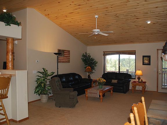 Here is a cabin in the woods that promises a relaxing getaway! Located in the popular Bison Ridge neighborhood, it features 2 bedrooms and 2 baths, an open floor plan with split bedrooms, plus a full sized deck to soak up the mountain scenery and far away views. Blending rural charm and modern conveniences, this home has all the touches expected--vaulted T & G ceilings, log accents, cultured stone gas fireplace, closeted pantry, dual vanities, solid surfaces, solid wood doors + trim and more. In the winter it's the perfect spot for enjoying the fireplace, while in the summer it's best to just sit back, relax, and take in the gorgeous forest surroundings. It is close to recreational activities, city services, shopping, parks, lakes and trail systems. Continued...