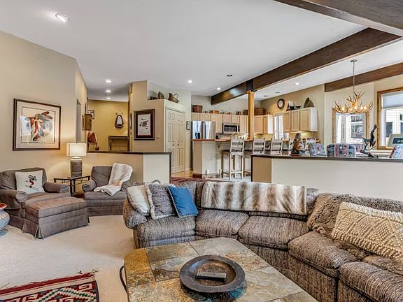 Main floor includes a full kitchen with new stainless steel appliances and a large breakfast bar, dining area, living area with large sectional and reading nook, a gas fireplace, TV for streaming using your own accounts, a 1/2 bath, and plenty of closet space in the foyer. Garage can be used to store your ski equipment.