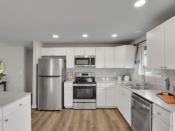 Completely updated 4+-bedroom, 2-bathroom home, ideally situated in the heart of Spokane—just minutes from shopping, dining, and outdoor activities. A bright, open-concept living space featuring luxury vinyl plank (LVP) flooring. The gorgeous, bright kitchen is complete with stainless steel appliances, soft-close shaker cabinets, a central island, and a deep double sink . Enjoy two generous living areas, each with a cozy wood-burning fireplace. New roof (2022) on both the home and detached 2-car garage and space for RV or boat parking.New water heater (2023) Step outside to a large trex deck overlooking the backyard, ready to landscape your way! The basement has a separate entrance, 5th room for a home office, and all appliances stay!