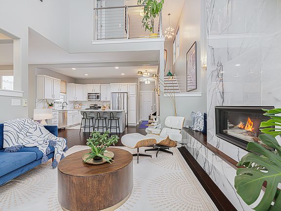 Coordinating backsplashBreathtaking custom fireplaceEuropean glass showerSoaring cathedral ceilingsModern railingsSleek quartz countertops