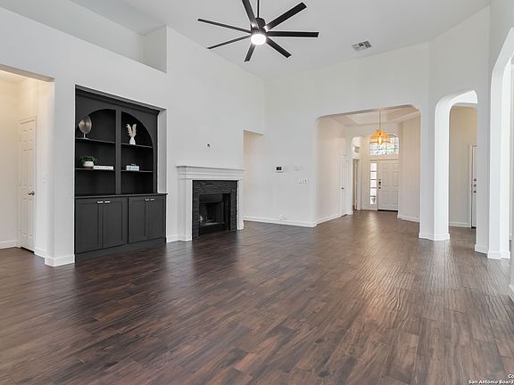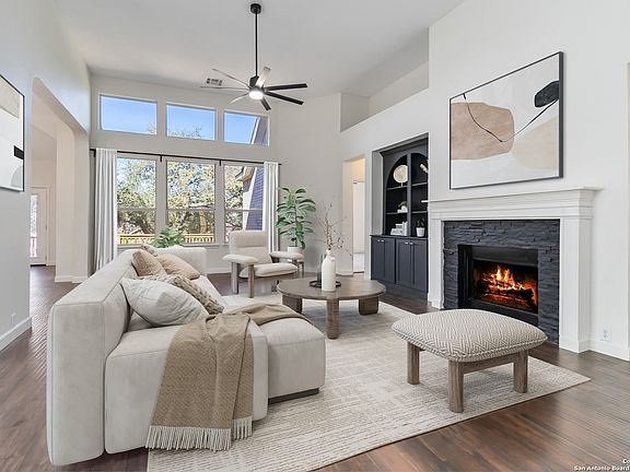 Welcome to Stonegate Hill Community-a highly sought-after gated enclave nestled in the serene Westover Hills area, surrounded by majestic old-growth trees that offer a tranquil retreat from the hustle and bustle of city life. Step into this stylish 4-bedroom home, where a grand entryway greets you with soaring ceilings and beautiful tile floors. The modern light fixtures and abundant windows fill the space with natural light, creating a warm and inviting ambiance. Unwind in the cozy living room by the fireplace, host memorable dinners in the elegant formal dining room, and unleash your culinary creativity in the expansive kitchen. The shaded backyard is perfect for relaxation, whether you're enjoying the deck or gathering around the outdoor fireplace on chilly evenings. All bedrooms, including a private office, are conveniently located on the main floor. The secluded primary suite is a true sanctuary, featuring a luxurious en-suite bathroom that every homeowner dreams of. Upstairs, discover a thoughtfully designed rec/media room. As a homeowner, you'll have access to fantastic community amenities, including a sparkling pool, tennis and basketball courts, a shaded playground, a clubhouse, picnic areas, and organized special events that foster a sense of community. Location is key! Enjoy top-tier healthcare with full-service hospitals, a variety of shopping and dining options, convenient freeway access, highly-rated NISD schools, and the excitement of SeaWorld & Santikos Movie Theater just minutes away. Don't miss out on the opportunity to take advantage of the seller's low VA assumable interest rate!