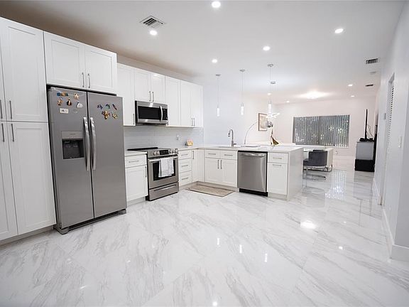 Granite and ss appliancesOpen floor planQuartz island countertopsTile floorsWood cabinetsHurricane panelsMaster shower