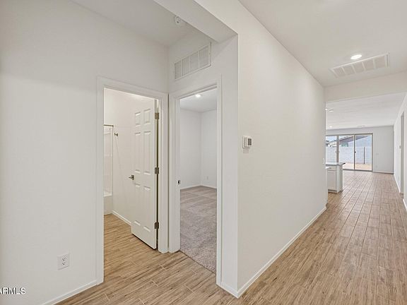 This Modern style Opal home boasts 2,123 sq ft of living space, featuring 4 bedrooms, 3 bathrooms, 2 car tandem with RV garage a separate den, and ample storage throughout. The open concept kitchen is perfect for entertaining family and friends with the kitchen featuring Fairview White 42'' upper cabinets with Satin Nickel pull cabinet hardware, Sublimity Datile Gloss Arctic White backsplash, beautiful - Ivory White quartz countertops, stainless steel gas stove, and a walk-in pantry designed with an organizer's dream in mind. You'll love the 4-panel center meet sliding glass door that utilizes the indoor and outdoor flow for a bright, airy feel, 9' ceilings, and Larchmont Canton 6 x 24 plank tile flooring. This home is in the heart of our two large green parks. The Amarillo Creek community is conveniently located near Route 347 for easy commuting to Phoenix, Chandler and Mesa. Just minutes away from an array of dining, shopping and entertainment options that Maricopa has to offer. Don't miss out on this beautifully appointed turn key home!