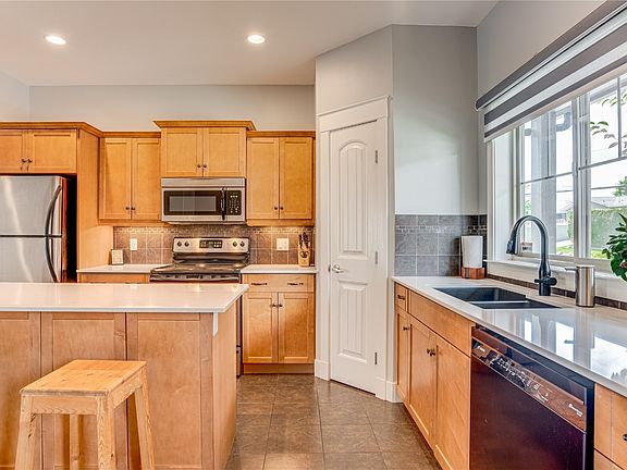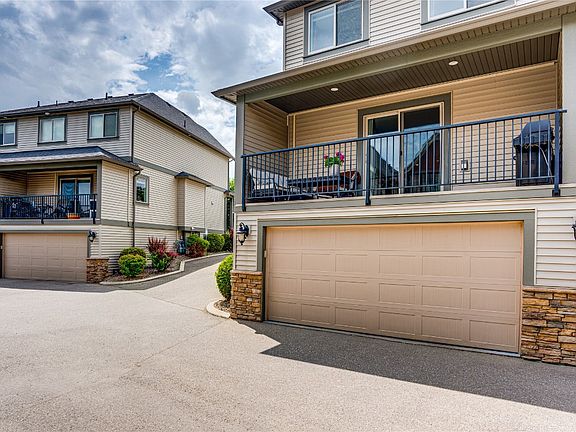 Quick possession available!! This move-in ready craftsman-style end-unit townhome is located in Bella Vista within a 5-minute convenient proximity to downtown Vernon, with public transit nearby. ICF foundation and concrete party wall for energy efficiency, sound transmission reduction & fire safety. The main floor sports a bright open-concept plan with 9' ceilings, hardwood & tile flooring, modern color palette with accent walls, and powder room. A very functional kitchen features an island, shaker cabinetry, walk-in pantry, new quartz countertops, new granite window sink, and a new SS tub Bosch dishwasher! The ample dining area flows into a large living room with corner gas fireplace and slider door access to a covered balcony. The spacious primary bedroom has a vaulted ceiling with fan, a generous walk-in closet, and a luxury 5pc ensuite with soaker tub, shower stall, separate sinks, and toilet closet. The large second primary bedroom comes with its own 4pc bath, walk-in closet and desk nook. The second level has a convenient laundry closet w stacking LG W/D. New oak veneer laminate flooring completes the floor plan. The finished basement boasts a large flex/rec room with new laminate flooring, 2pc bath, mechanical room, and access to the double garage. Additional updates include new carpeting on staircases, new H/W/T, paint updates & newer A/C unit. Walking distance to Planet Bee or Davidson's Orchard. Minutes away from parks, shops, schools, Rise GC & beaches. A must see!