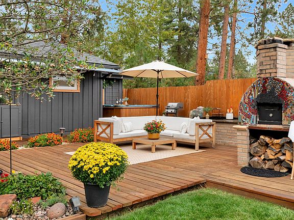 A fully equipped outdoor kitchen and fireplace area includes a wood-fired pizza oven, ideal for making memories around the table. Relax by the tumbled concrete fire pit or soak in the 6-person hot tub under the stars. Whether you're sipping morning coffee while listening to the bird paradise or hosting a fun evening with friends, the setting is peaceful, private, and perfect.