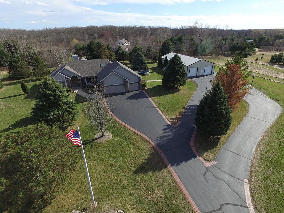 Impressive country estate on 5+ acres! Beautiful home plus a 36x70 outbuilding! Welcoming foyer which opens to a formal dining room and the great room with cathedral ceiling and natural fireplace. Adjoining is the spacious kitchen and dinette with granite counters and patio door to huge entertaining decks and pool. Master suite with his/hers closets, cathedral ceiling, and luxurious master bath. Main floor laundry room with stairs leading to a complete rec room with formal bar, self service wet bar, game room, full bathroom, and a den/office/guest room. There is an oversized 3 car garage plus the heated 36x70 outbuilding with concrete floor, separate gas & electric meters.
