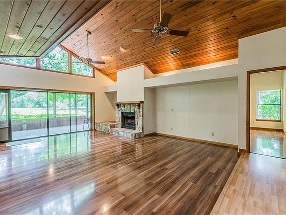 Custom designed, by Ron Manzo, designer of Golden Oaks, this country estate is on nearly 4 acres. The long, inviting, gravel driveway leads to this beautiful contemporary plan home with high tongue and groove knotty pine ceilings in the living areas and wood laminate floors and to complete the look there is even a stone wood-burning fireplace, and a beautiful 20 foot glass pocket sliders leading to a screened-in porch, great for entertaining the family or large parties. The generous sized master bedroom, on the first floor, features a den/nursery with an attached cedar closet. The oversized kitchen has a dining area and breakfast nook with stainless appliances. Plenty of storage under stairs, half bath downstairs and large laundry room. The upstairs bedrooms share Jack & Jill bath. Oak trees cover the property, with plenty of room for your horses. This property also features a partially fenced yard, 2 car attached carport and 2 car garage. No HOA, close to everything and property can possibly divided into 3 more lots.