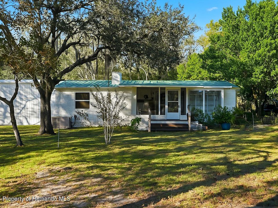 The home includes a 4-car attached carport, plus an additional detached 2-car carport with power, perfect for vehicles, toys, workshops, or hobby storage. An additional powered she-shed offers the ideal creative hideaway or extra storage as needed. The grounds showcase an impressive variety of fruit trees and lush plant life, creating your very own nature-filled sanctuary. With two gated entrances, easy access and secure privacy are ensured. On the front porch you'll find the homes very own grow room! Perfect for growing seasonal plants and herbs that wont stay alive in the Florida heat. Inside, you'll be presented with a cozy bungalow-style layout. It is filled with tons of charm, while outside, a large covered and open deck provides the perfect setting for entertaining, relaxing, or simply enjoying Florida's peaceful evenings. The home features a metal roof and skylights and wood plank floors, bringing in beautiful natural light and accent colors throughout. In the heart of the residence sits a beautiful wood burning fireplace as well. If you're looking for character, space, and a property with a story—this Homosassa gem is ready to welcome its next chapter.