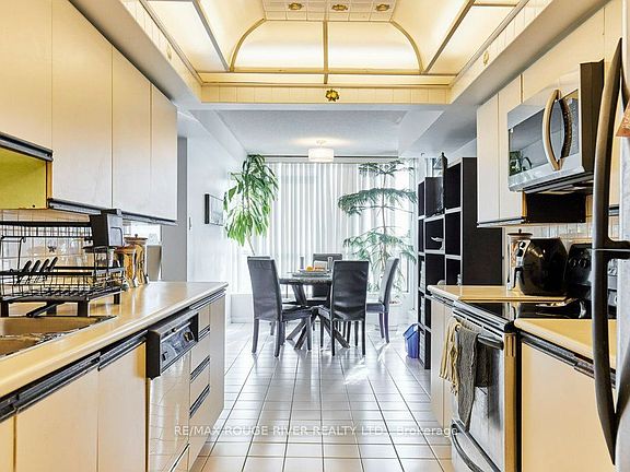 On the sunny and quiet south side! Very spacious, well-maintained suite; huge windows/ light-filled, 2 bedrooms, 2 full baths and a total 1,326 sq ft. Split bedroom floor plan (west wing/east wing) for maximum privacy. Huge living room/dining room with hardwood floors; in fact, the entire suite is carpet-free. Spacious and functional central kitchen with large eat-in area and balcony access; double sink; ceramic floors and backsplash; stainless steel fridge, stove and brand new microwave/range hood; built-in dishwasher; and the perfect task lighting provided by a genuine retro Florida ceiling. Generous primary bedroom offers walk-in closet with custom organizers and direct balcony walk-out; ensuite bathroom features a soaker tub and granite vanity countertop. Laundry is insuite and there's 1 underground parking spot. This building has all the amenities: 24-hr concierge; indoor and outdoor pools; ample visitor parking; squash and tennis courts; exercise room, billiards room and party room. Fantastic location, minutes from Scarborough Town Centre; transit on Sheppard Ave and 401 interchanges at McCowan Rd and at Markham Rd; future Sheppard & McCowan subway station almost directly across the street. Must be seen!