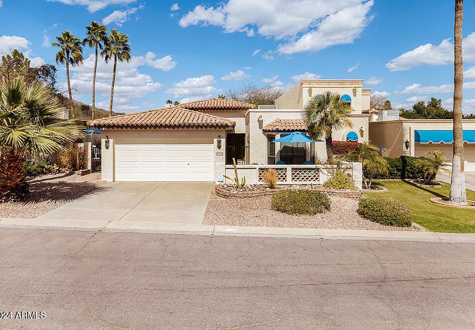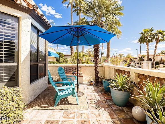 Check out this charming patio style home on the 10th hole just out of earshot of the tee box. Enjoy direct views of south mountain as well as a convenient location. Over the past five years this property has received a new AC unit, leveled floor, new tile and carpet, kitchen tile backsplash, interior and exterior paint, updated guest bath, can lights thru ought, all new ceiling fans, French doors, new window shades and blinds, new light fixtures thru ought, new dishwasher, new skylight in primary, tinted windows, new water heater, roof recently serviced, built in storage racks in garage, new epoxy in garage, new backyard pergola, new low water and low maintenance backyard landscaping. Come see it today!