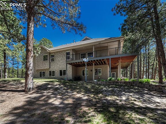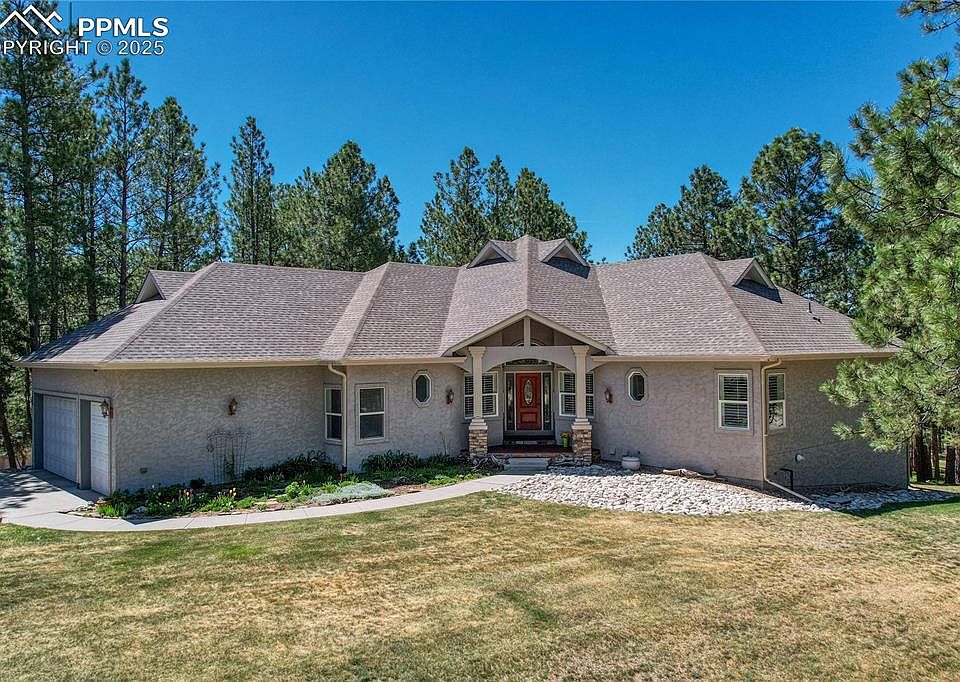 ONE STORY HOME WITH MANY RECENT UPGRADES THROUGHOUT including rustic Brazilian Cherry hardwoods, travertine floors & kitchen back splash, slab granite counter tops, stained glass lighting fixtures, gas fireplace with a remarkable floor to ceiling surround, & 12' ceilings. Main level has 3 bedrooms, 3 bathrooms, formal dining area, gourmet kitchen, breakfast nook, sizable laundry room, and an impressive grand entrance/main living area. Large wrap around covered composite deck, finished walkout basement, and gazebo. Other items include 2 fully finished work shops/garages with cement floors, heat, electricity, lighting, insulation, & RV door, attached 3 vehicle garage plus additional parking on the lot. Primary suite has a 5 piece bathroom, walk-in closet, dual sink vanity, and walkout door to the deck. Basement has a carpeted 2nd living area, multi-purpose room with LVP flooring with many uses(workout room, craft room), bonus area perfect for a wine cellar, bedroom, bathroom, and plenty of storage. Two detached garages are fully finished with insulation, sheet rock, paint, concrete floors, garage door openers, storage cabinets, motion activated security lights, pellet heat stoves, individual electric sub panels, entrance doors, and have their own asphalt driveway. Other items include security system, computerized water purification system/softener, two newer water heaters (2020), furnace & A/C systems (2022), and recently replaced kitchen appliances. Largest garage was recently finished in 2024 and includes a 12' door, steel siding, and steel roof. Private, Quiet lot has lots of Ponderosa Pines and is minutes from downtown Elizabeth near CR 21 & Hwy 86.