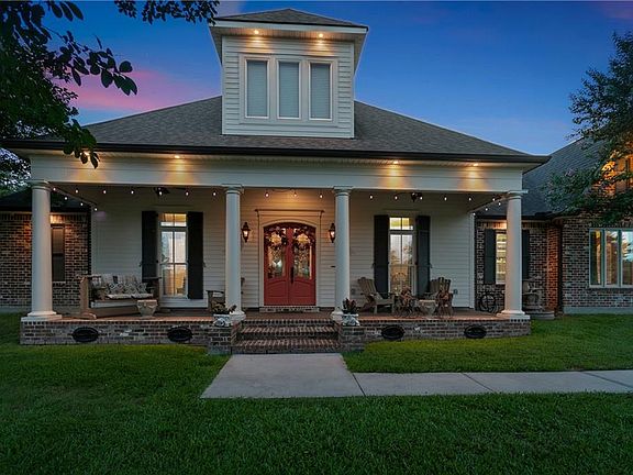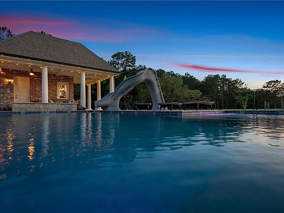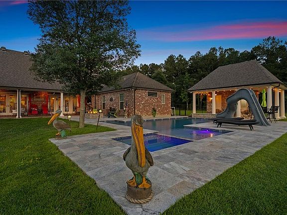 This is an incredible country retreat that spans 11.581 lush, groomed acres. This property has been lovingly and thoughtfully built, offering a blend of rustic charm, modern amenities and premium building materials. Inside, the home is filled with light, especially in the showplace den, where a wall of lowE, impact resistant windows and doors overlook the backyard. This spacious room features built-in media shelving, a fireplace, and a wet bar. The kitchen is a chef's dream, featuring granite counters and backsplash, stainless steel luxury appliances including the Bosch double ovens, and Kimper solid cherry cabinets with a whiskey glaze. The sunny breakfast nook, comparable in size to the formal dining room, offers a charming space for family meals. The owner's suite is a spacious retreat with a wood feature wall and wide plank flooring. The en-suite bathroom is equally impressive, with a large glass spa shower, separate sinks and two walk in closets. The home also includes a second living or media room upstairs with guest bedroom and full bath. The walk-up attic was built large enough to finish out as additional living space. Filled with extras, including a designated office that can be the 5th bedroom and an air conditioned three-bay garage plus a separate workshop. Every room features solid doors providing excellent insulation and sound-proofing. Enjoy a private paradise in your own backyard with plenty of covered entertaining areas featuring an outdoor kitchen, a fireplace, 2 pavilions, and a playground. The ceiling of the patio features 100+yr old wood beams from the Fireman's Union Hall in the French Quarter. The pool pavilion has a bathroom with cedar walls and a storage room. Outdoor enthusiasts will appreciate the 1 acre pond, complete with fountain, providing a serene spot to unwind and watch wildlife across the well groomed back acreage. Additionally, the property is equipped with an electric gate and a Generac generator, ensuring comfort and security.
