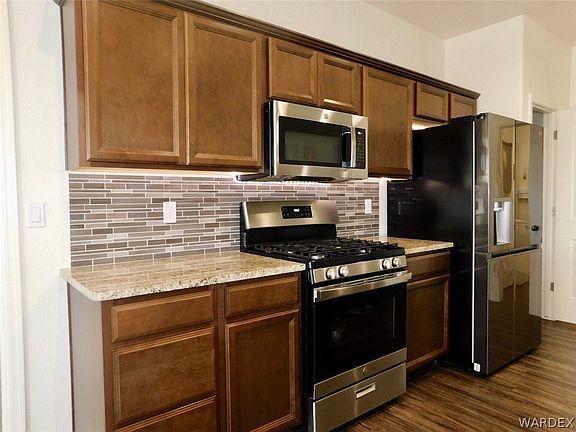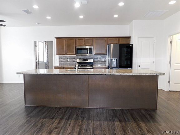 This 2022 Newly Built Home still under New Builders Home Warranty is ready to be your forever home. As you enter the front door you are greeted with beautiful laminate dark wood flooring. Enjoy the gas fireplace in the large living room. The 3 Car Garage is deep with extra height for larger vehicles. The kitchen boasts a walk in pantry and open concept with a large island. The breakfast nook has a perfect view of the backyard. The backyard backs up to a wash for added privacy and a clear view of the Hualapai Mountains. To the side of the backyard there is a fenced in dog run to keep your pets safely kenneled away. Side RV Parking with 50 Amp Outlet with full hook ups including a dump station. The wrought iron fence keeps your RV or Boat stored away securely. Laundry built for gas or electric. Extra large lot with room for you to build the pool of your dreams. Walking distance for the future location of the new park. Minutes away from local shopping and all your necessary needs in town. 1% Rate Buy Down for qualified buyer and accepted offer.