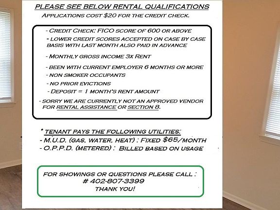 SAME DAY SHOWINGS AVAILABLE 7AM TO 8PM EVERYDAY! FOR QUICKEST RESPONSE PLEASE CALL AND -LEAVE A VOICE-MESSAGE- IF YOU ARE INTERESTED/WOULD LIKE A SHOWING, THANK YOU, DONT FORGET TO LEAVE A VOICE MESSAGE! ( text messaging not available on leasing line.) - Cats are allowed, $25/month per animal, no pet deposit required. Sorry we are not able to accommodate dogs at this specific property due to insurance requirements. TENANT PAYS UTILITIES: $65/month for MUD (gas, heat,water) and O.P.P.D.(metered). APPLICATIONS: cost $20 per adult, and are made available after showings. - DEPOSIT = 1 month rent amount. Method of contact: All inquiries and communications must be made by phone only for a response.
