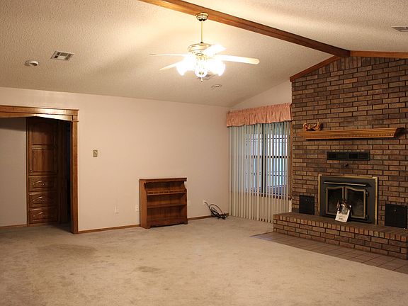 LIVING ROOM: 19.3 x 20.4, Carpet, slightly vaulted ceiling with wooden beam, ceiling fan with light, accent lighting, raised hearth brick fireplace with woodburning Country Flame fireplace with blowers and vented throughout the home. There is access to the rear enclosed sunroom and patio.