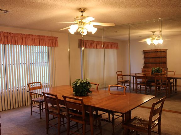 DINING ROOM: 13.6 x 17.3, Carpet, wall of mirrors, white textured walls, and ceiling fan with light. The dining room is open off the entry and separated from the living room by a half wall. There is a double window overlooking the front yard and affords plenty of light.