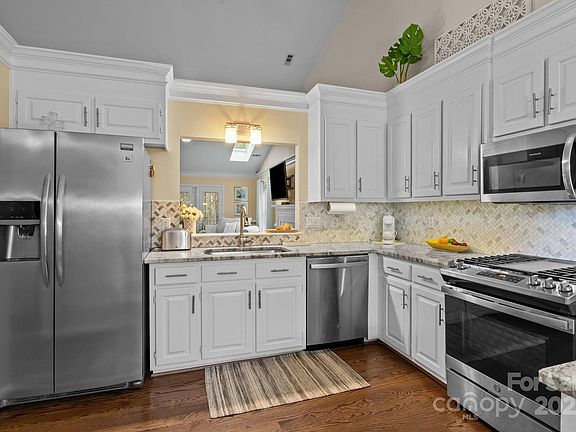 Rare one story nestled in a wooded oasis in Charlotte’s desirable Davis Lake community! This 3-bedroom, 2-bath home features an open floor plan with vaulted ceilings, a cozy gas fireplace in the family room, hardwood floors, and a modern kitchen with granite countertops and a large pantry. Enjoy a bright year round sunroom overlooking a private, landscaped backyard and spacious deck perfect for entertaining. Multi-purpose Sunroom can be used as home office, den, playroom or fitness room. A beautiful forest of tall trees provide a serene sanctuary on your private deck. The primary suite offers a walk-in closet and spa-style bath with soaking tub and dual sinks. Move-in ready with fresh updates throughout. Most recent updates include AC, Heater, All ductwork, Water Heater, Skylights, & Kitchen Appliances. Davis Lake amenities include a pool, tennis courts, clubhouse, playground, and scenic walking trails. You can access a walking trail right from your backyard. Conveniently located near Uptown Charlotte, Huntersville, University and major highways, this single-level home combines comfort, style, and an unbeatable location.